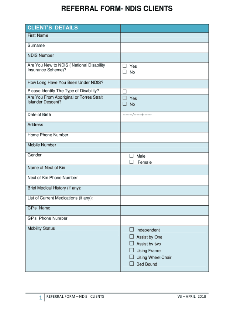 REFERRAL FORM NDIS CLIENTS CLIENTS DETAILS First Name Surname NDIS Number Yes NoPlease Identify The Type of Disability? Are You From Aboriginal or Torres Strait Islander Descent? Yes NoDate of Birth//Are