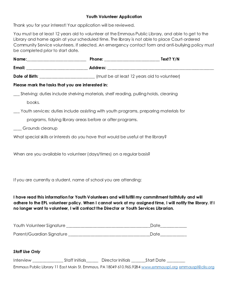 Get the free You must be at least 12 years old to volunteer at the Emmaus Public Library, and abl...