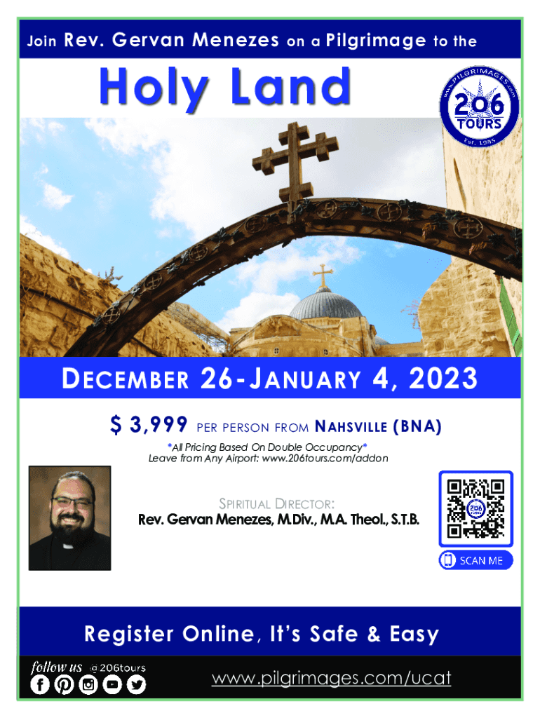 JoinRev. Gervan Menezeson aPilgrimage to theHoly LandD ECEMBER 26J ANUARY 4, 2023 $ 3,999PER PERSON FROMN AHSVILLE (BNA)*All Pricing Based On Double Occupancy* Leave from Any Airport: www.206tours.com/addonSPIRITUAL