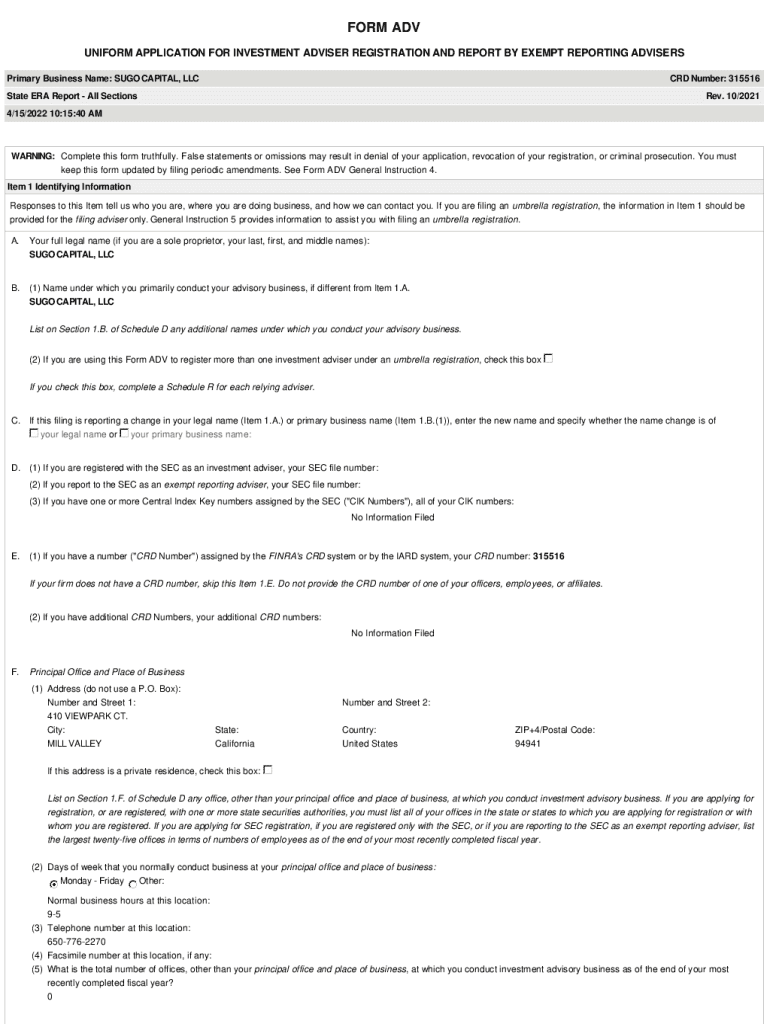 FORM ADV UNIFORM APPLICATION FOR INVESTMENT ADVISER REGISTRATION AND REPORT BY EXEMPT REPORTING ADVISERS Primary Business Name: SUGO CAPITAL, LLCCRD Number: 315516State ERA Report All SectionsRev.