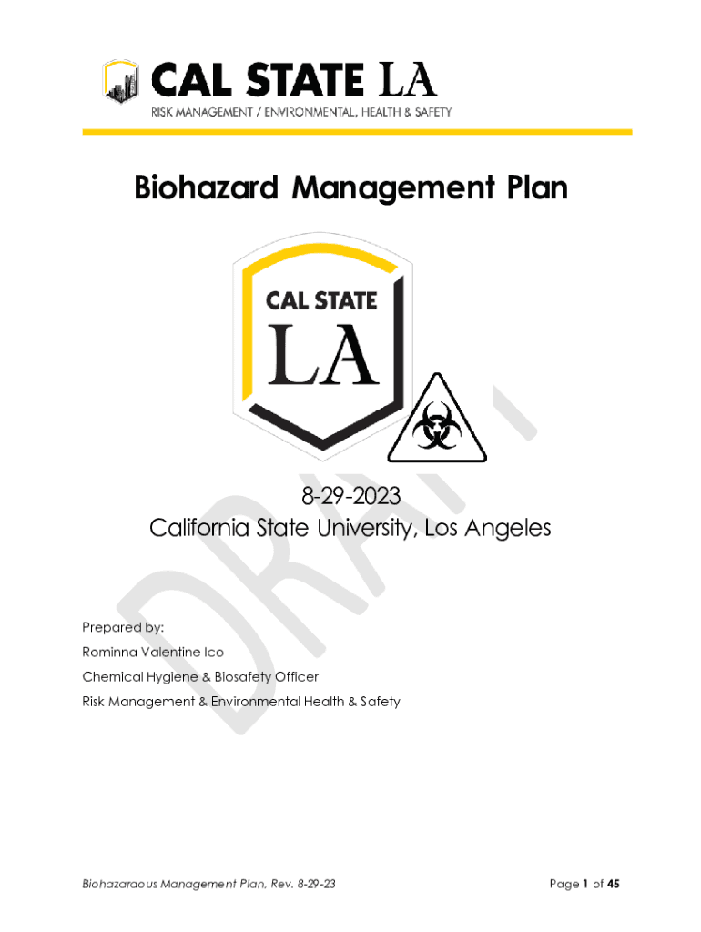 Biohazard Management Plan8292023 California State University, Los AngelesPrepared by: Rominna Valentine Ico Chemical Hygiene & Biosafety Officer Risk Management & Environmental Health & SafetyBiohazardous