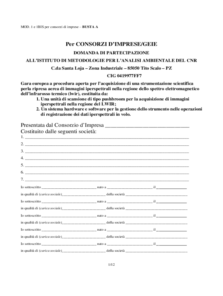 MOD. 1 e 1BIS per consorzi di imprese BUSTA APer CONSORZI DIMPRESE/GEIE DOMANDA DI PARTECIPAZIONE ALLISTITUTO DI METODOLOGIE PER LANALISI AMBIENTALE DEL CNR C.da Santa Loja Zona Industriale 85050