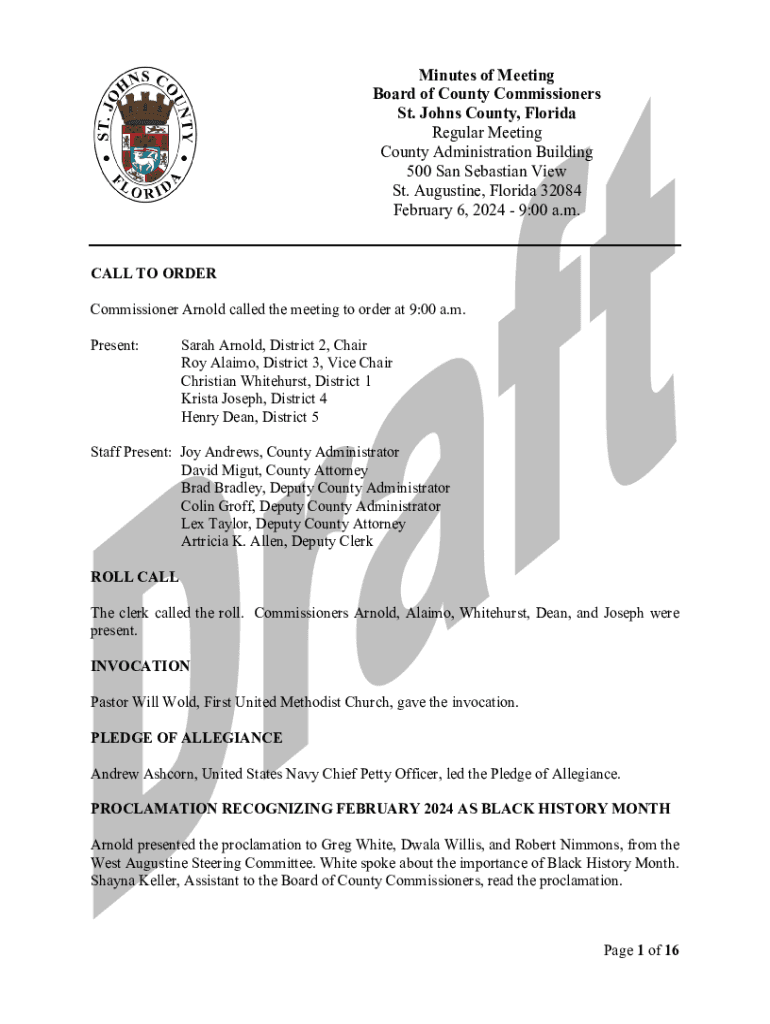 Minutes of Meeting Board of County Commissioners St. Johns County, Florida Regular Meeting County Administration Building 500 San Sebastian View St. Augustine, Florida 32084 February 6, 2024 9:00