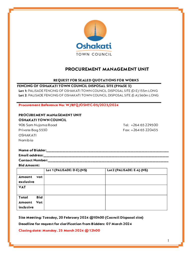 PROCUREMENT MANAGEMENT UNIT REQUEST FOR SEALED QUOTATIONS FOR WORKS FENCING OF OSHAKATI TOWN COUNCIL DISPOSAL SITE (PHASE 3) Lot 1: PALISADE FENCING OF OSHAKATI TOWN COUNCIL DISPOSAL SITE (DE) 155m