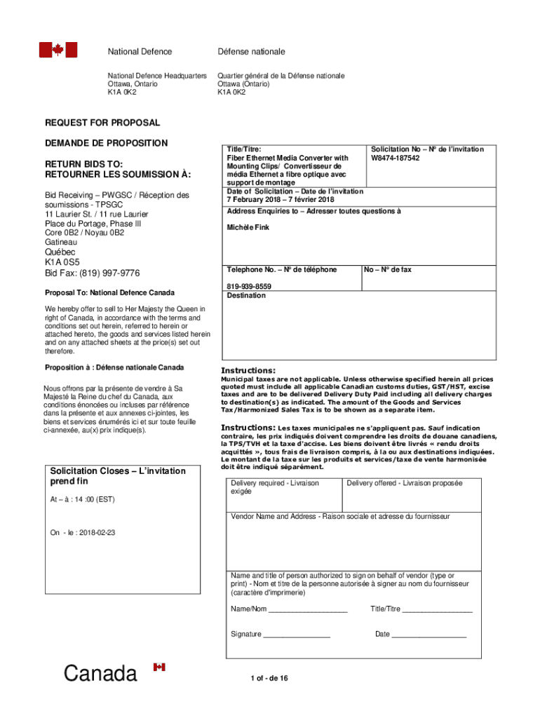 National DefenceDfense nationaleNational Defence Headquarters Ottawa, Ontario K1A 0K2Quartier gnral de la Dfense nationale Ottawa (Ontario) K1A 0K2REQUEST FOR PROPOSAL DEMANDE DE PROPOSITION RETURN