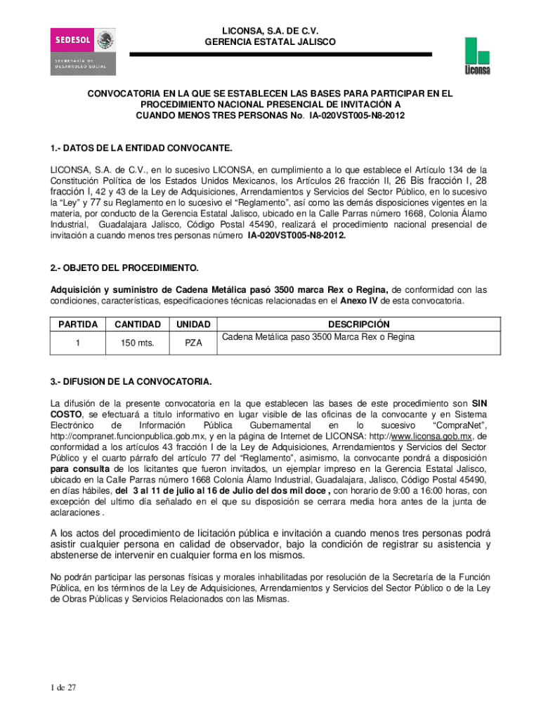 LICONSA, S.A. DE C.V. GERENCIA ESTATAL JALISCOCONVOCATORIA EN LA QUE SE ESTABLECEN LAS BASES PARA PARTICIPAR EN EL PROCEDIMIENTO NACIONAL PRESENCIAL DE INVITACIN A CUANDO MENOS TRES PERSONAS No. IA020VST005N820121.