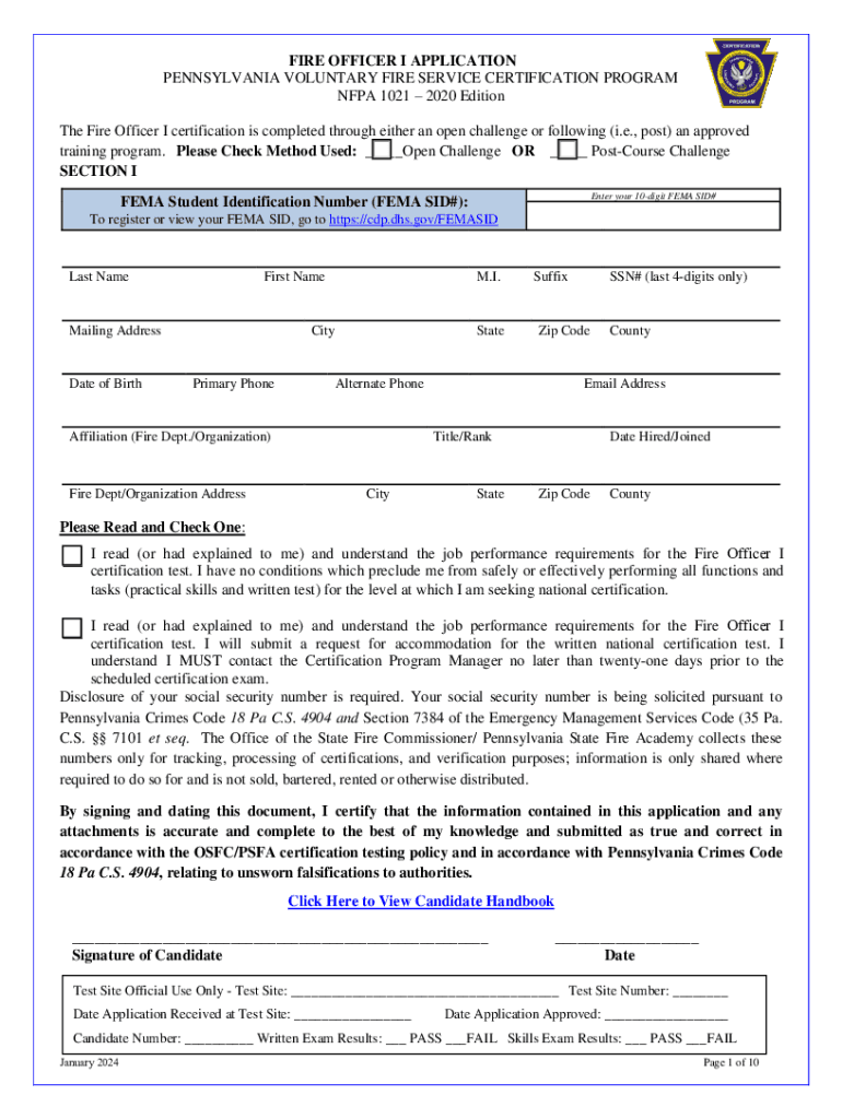 ALL CERTIFICATION APPLICATIONS MUST BE TYPED FIRE OFFICER I APPLICATION PENNSYLVANIA VOLUNTARY FIRE SERVICE CERTIFICATION PROGRAM NFPA 1021 2020 Edition MUST USE YOUR LEGAL NAME AS SHOWN ON GOVERNMENT