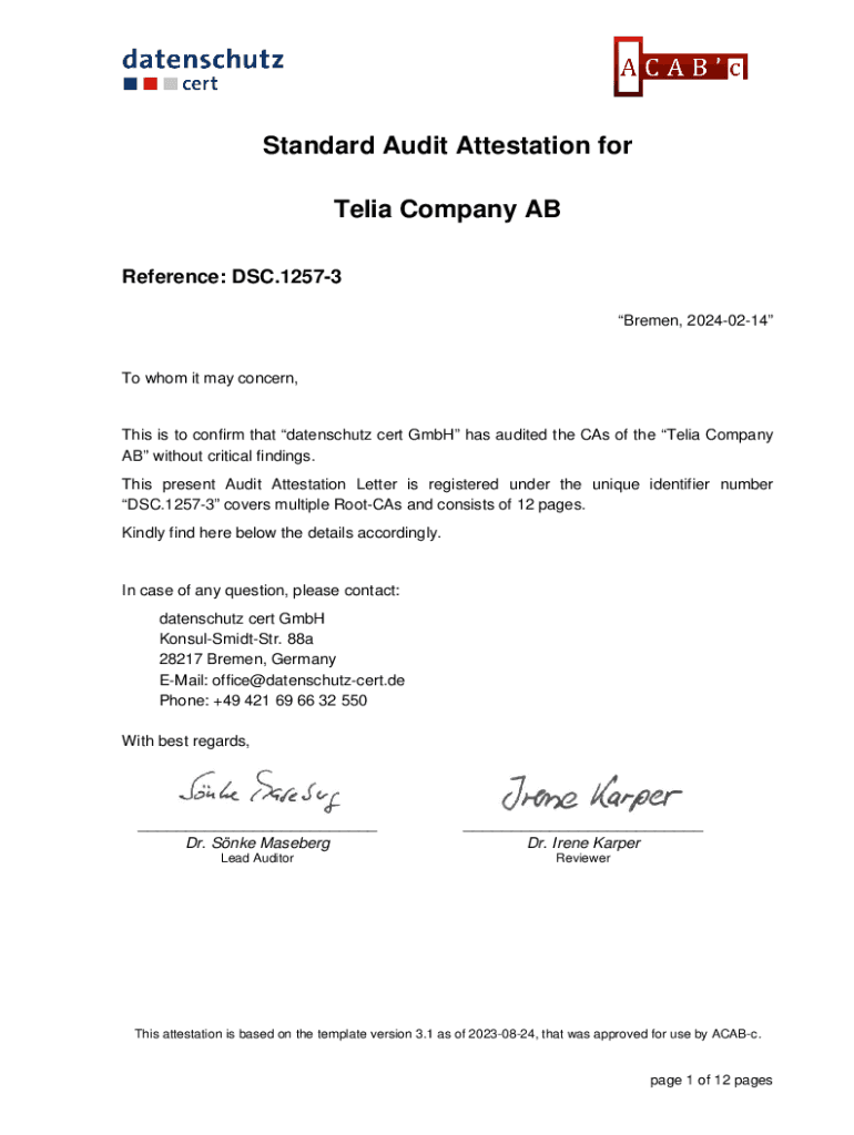 Standard Audit Attestation for Telia Company AB Reference: DSC.12573 Bremen, 20240214To whom it may concern,This is to confirm that datenschutz cert GmbH has audited the CAs of the Telia Company AB