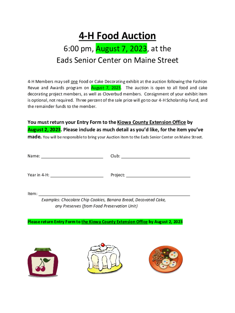 4H Food Auction6:00 pm, August 7, 2023, at the Eads Senior Center on Maine Street 4H Members may sell one Food or Cake Decorating exhibit at the auction following the Fashion Revue and Awards program