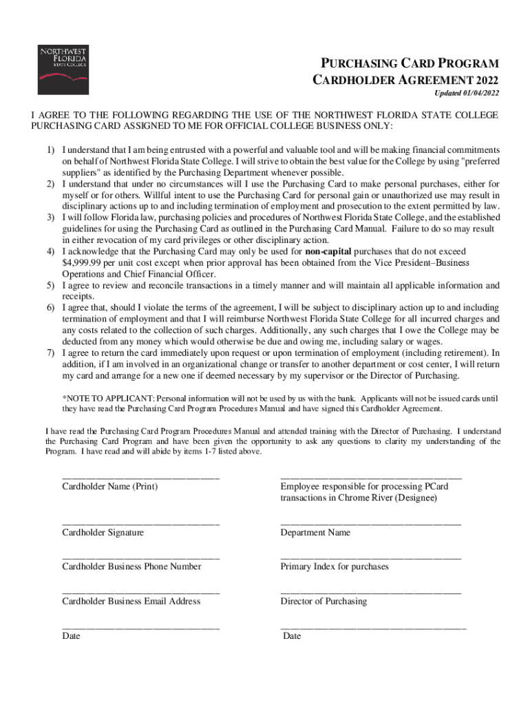 PURCHASING CARD PROGRAM CARDHOLDER AGREEMENT 2022Updated 01/04/2022I AGREE TO THE FOLLOWING REGARDING THE USE OF THE NORTHWEST FLORIDA STATE COLLEGE PURCHASING CARD ASSIGNED TO ME FOR OFFICIAL COLLEGE