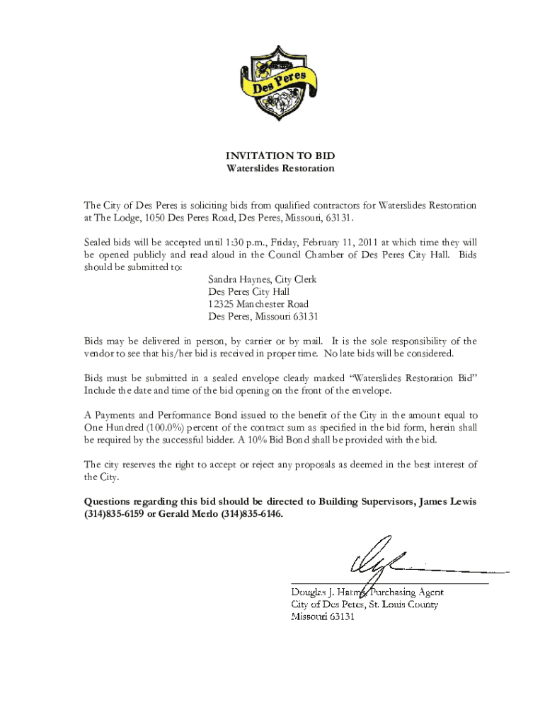 Get the free INVITATION TO BID Waterslides Restoration The City of Des Peres ...