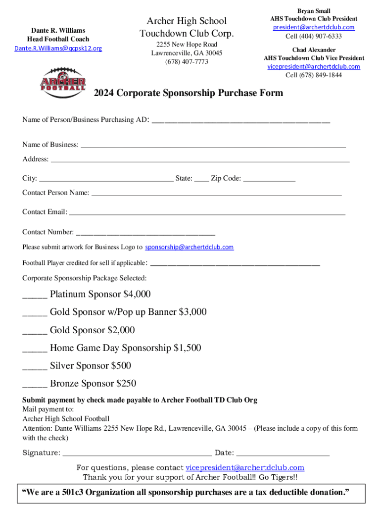 Dante R. Williams Head Football Coach Dante.R.Williams@qcpsk12.orgArcher High School Touchdown Club Corp. 2255 New Hope Road Lawrenceville, GA 30045 (678) 4077773Bryan Small AHS Touchdown Club Presidentpresident@archertdclub.com