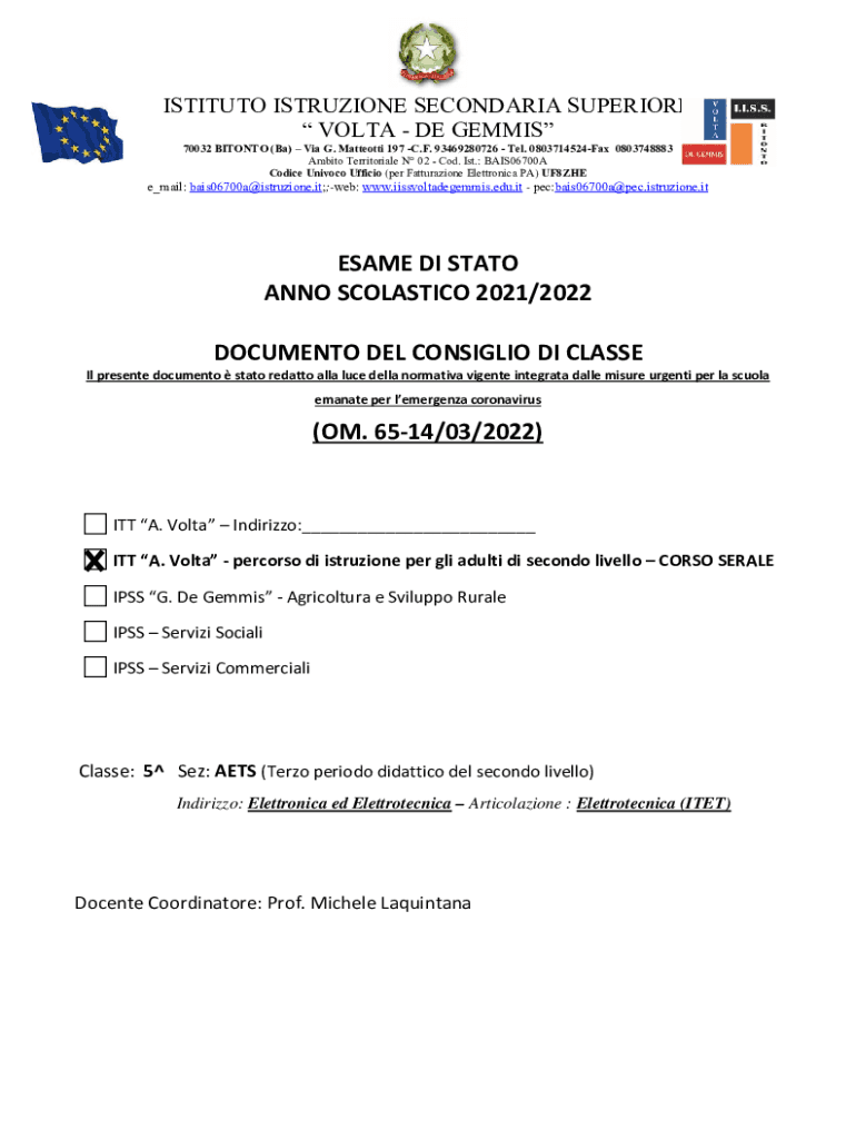 ISTITUTO ISTRUZIONE SECONDARIA SUPERIORE VOLTA DE GEMMIS 70032 BITONTO (Ba) Via G. Matteotti 197 C.F. 93469280726 Tel. 0803714524Fax 0803748883 Ambito Territoriale N 02 Cod. Ist.: BAIS06700A Codice