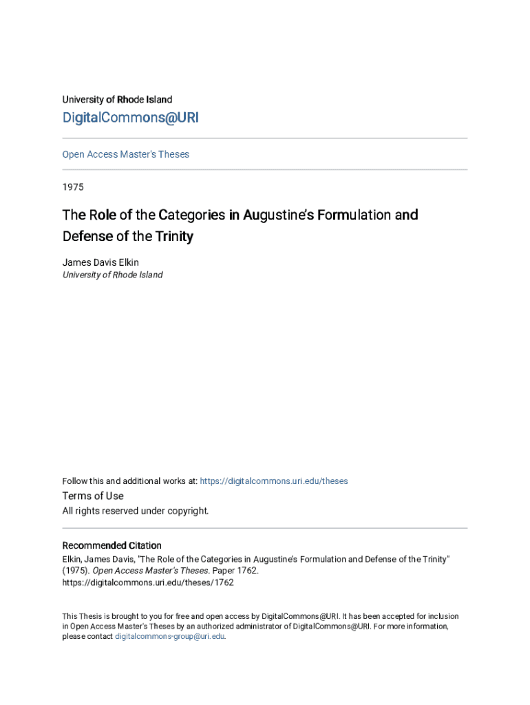 University of Rhode IslandDigitalCommons@URI Open Access Master\'s Theses 1975The Role of the Categories in Augustines Formulation and Defense of the Trinity James Davis Elkin University of Rhode