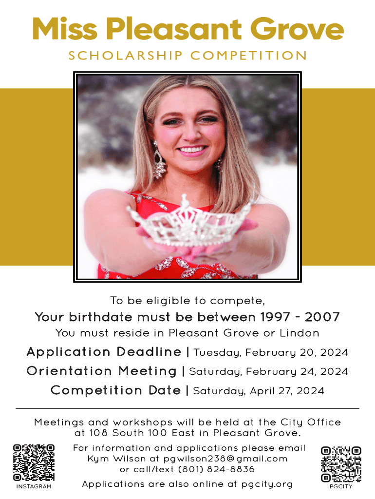 SCHOLARSHIP COMPETITIONTo be eligible to compete,Your birthdate must be between 1997 2007 You must reside in Pleasant Grove or LindonApplication Deadline | Tuesday, February 20, 2024 Orientation Meeting