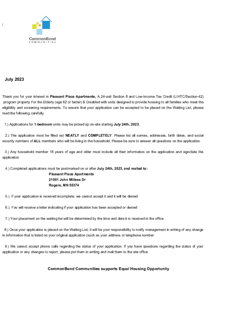 JJuly 2023Thank you for your interest in Pleasant Place Apartments, A 24unit Section 8 and LowIncome Tax Credit (LIHTC/Section42) program property For the Elderly (age 62 or better) & Disabled with