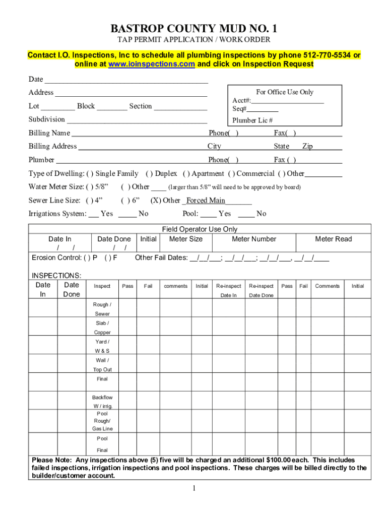 BASTROP COUNTY MUD NO. 1 TAP PERMIT APPLICATION / WORK ORDERContact I.O. Inspections, Inc to schedule all plumbing inspections by phone 5127705534 or online at www.ioinspections.com and click on Inspection