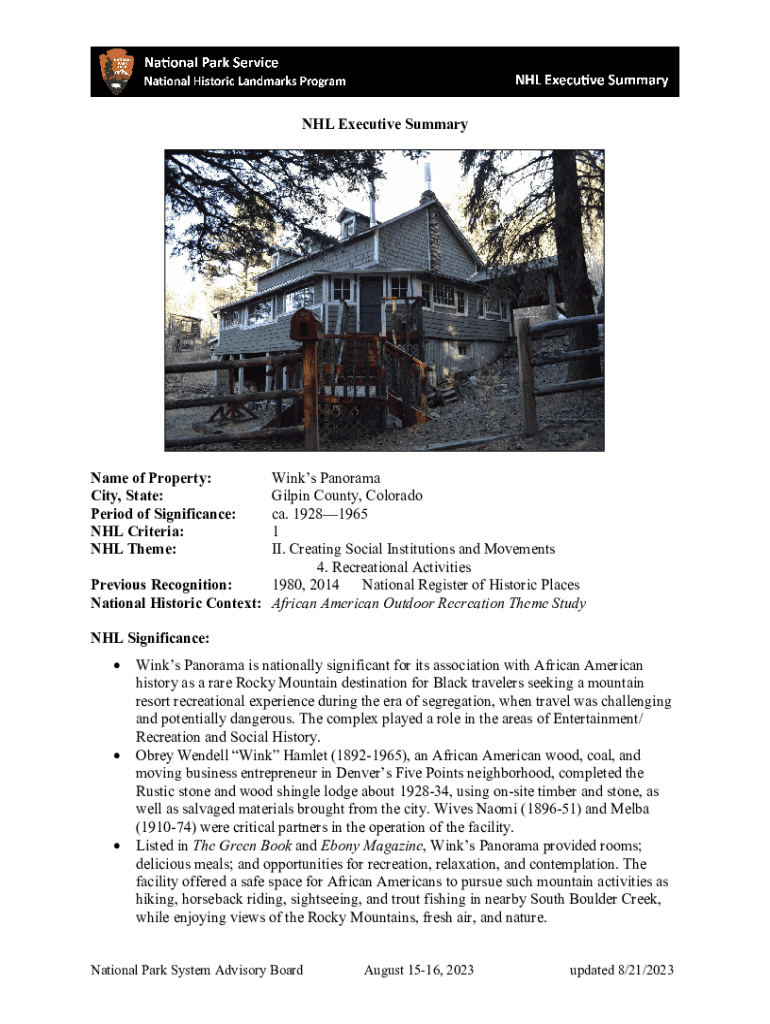 NHL Executive SummaryName of Property: City, State: Period of Significance: NHL Criteria: NHL Theme:Winks Panorama Gilpin County, Colorado ca. 19281965 1 II. Creating Social Institutions and Movements