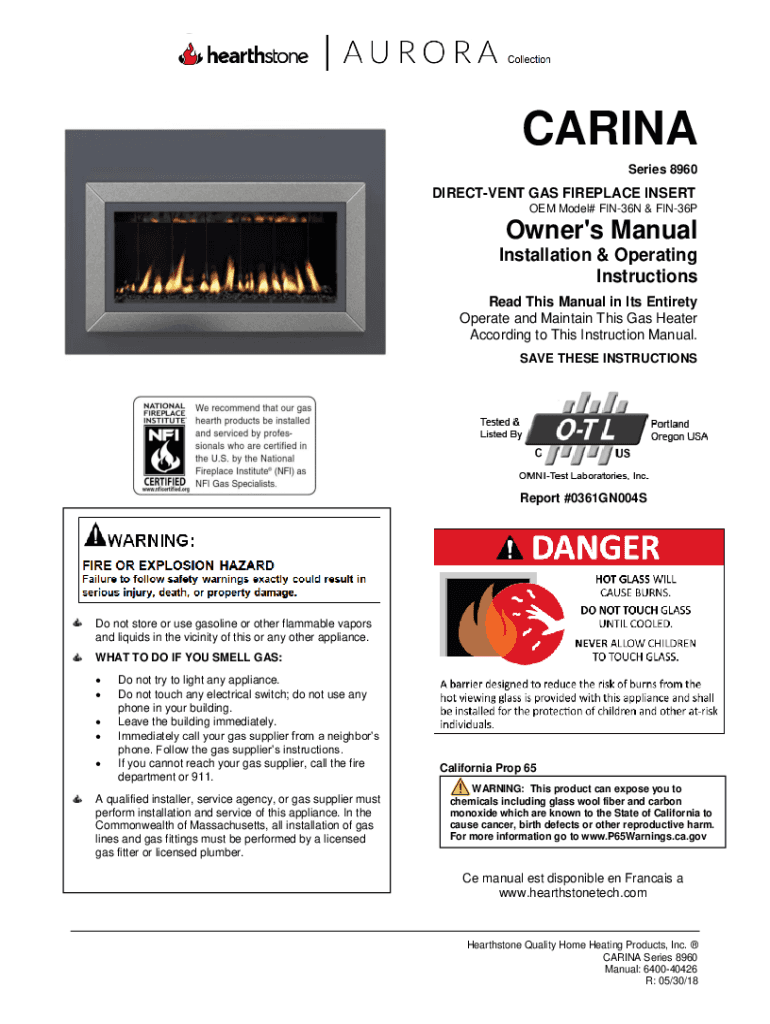 CARINA Series 8960DIRECTVENT GAS FIREPLACE INSERT OEM Model# FIN36N & FIN36POwner\'s Manual Installation & Operating Instructions Read This Manual in Its Entirety Operate and Maintain This Gas Heater