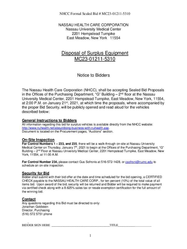 NHCC Formal Sealed Bid # MC23012115310 NASSAU HEALTH CARE CORPORATION Nassau University Medical Center 2201 Hempstead Turnpike East Meadow, New York 11554Disposal of Surplus Equipment MC23012115310