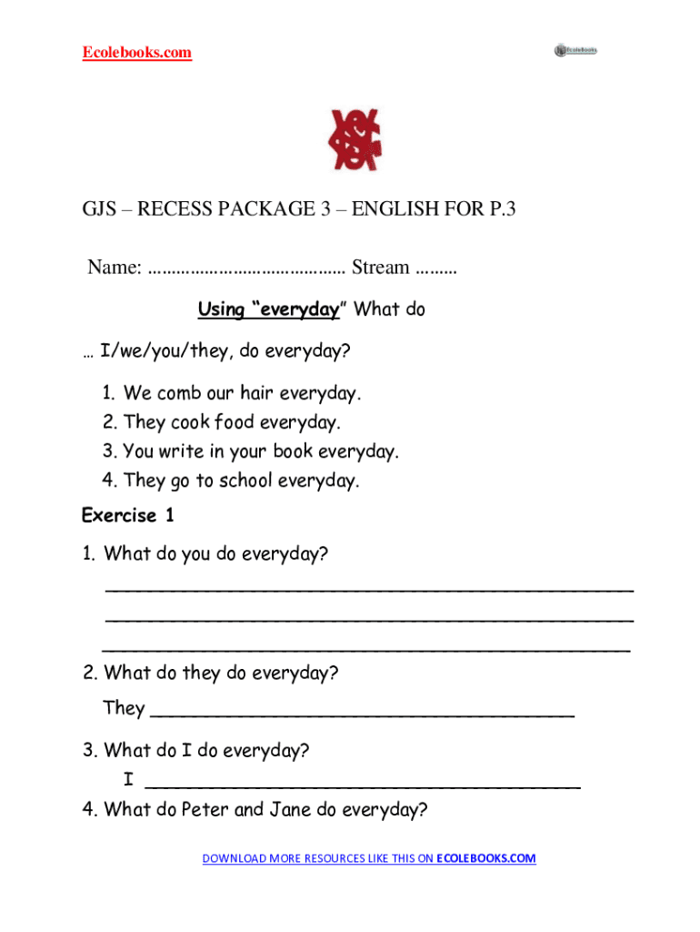 Ecolebooks.comGJS RECESS PACKAGE 3 ENGLISH FOR P.3 Name: Stream Using everyday What do I/we/you/they, do everyday? 1. We comb our hair everyday. 2. They cook food everyday. 3. You write in your book