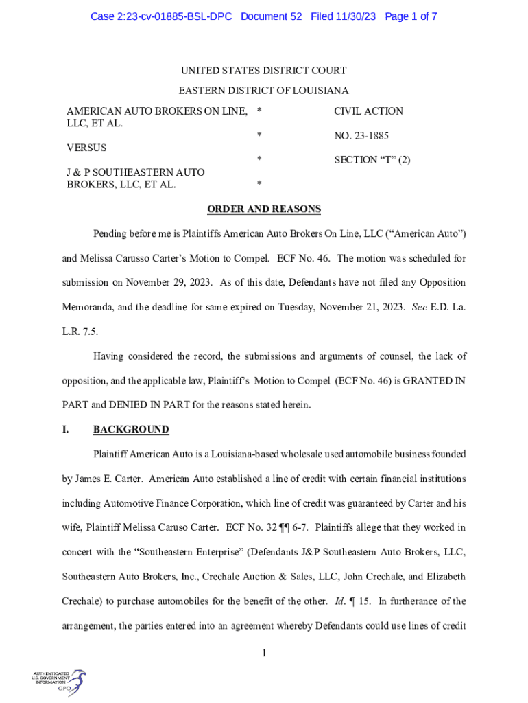 Case 2:23cv01885BSLDPC Document 52 Filed 11/30/23 Page 1 of 7UNITED STATES DISTRICT COURT EASTERN DISTRICT OF LOUISIANA AMERICAN AUTO BROKERS ON LINE, * LLC, ET AL. * VERSUS * J & P SOUTHEASTERN AUTO