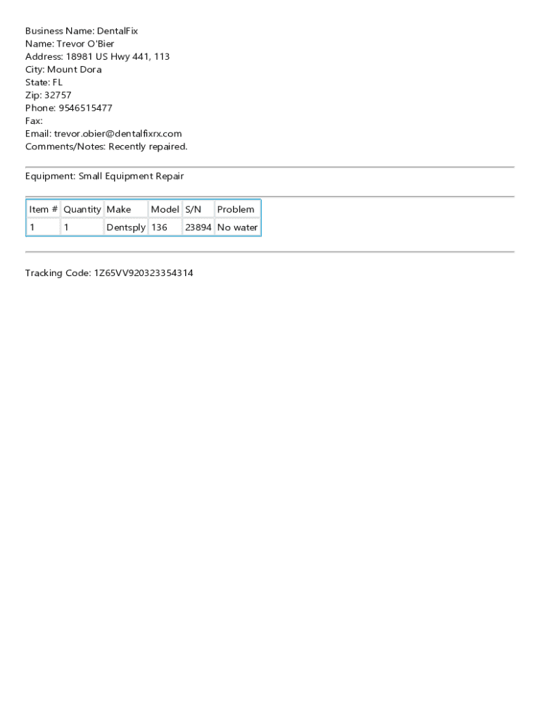 Business Name: DentalFix Name: Trevor O\'Bier Address: 18981 US Hwy 441, 113 City: Mount Dora State: FL Zip: 32757 Phone: 9546515477 Fax: Email: trevor.obier@dentalfixrx.com Comments/Notes: Recently