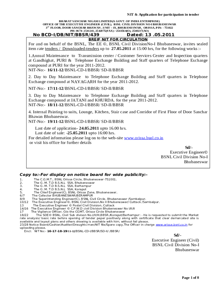 The No BCD-I/DB/NIT/BBSR/439Dated: 13 is a writable document which can be filled-out and signed for specific needs. Then, it is furnished to the actual addressee in order to provide certain info of any kinds. The completion and signing is available in hard copy by hand or using an appropriate tool like PDFfiller. These tools help to send in any PDF or Word file without printing them out. It also allows you to edit it for your needs and put a valid e-signature. Once finished, the user sends the No BCD-I/DB/NIT/BBSR/439Dated: 13 to the respective recipient or several recipients by email and also fax. PDFfiller offers a feature and options that make your Word form printable. It includes different options when printing out. It does no matter how you deliver a document - physically or electronically - it will always look professional and organized. In order not to create a new editable template from the beginning over and over, make the original Word file as a template. After that, you will have an editable sample.