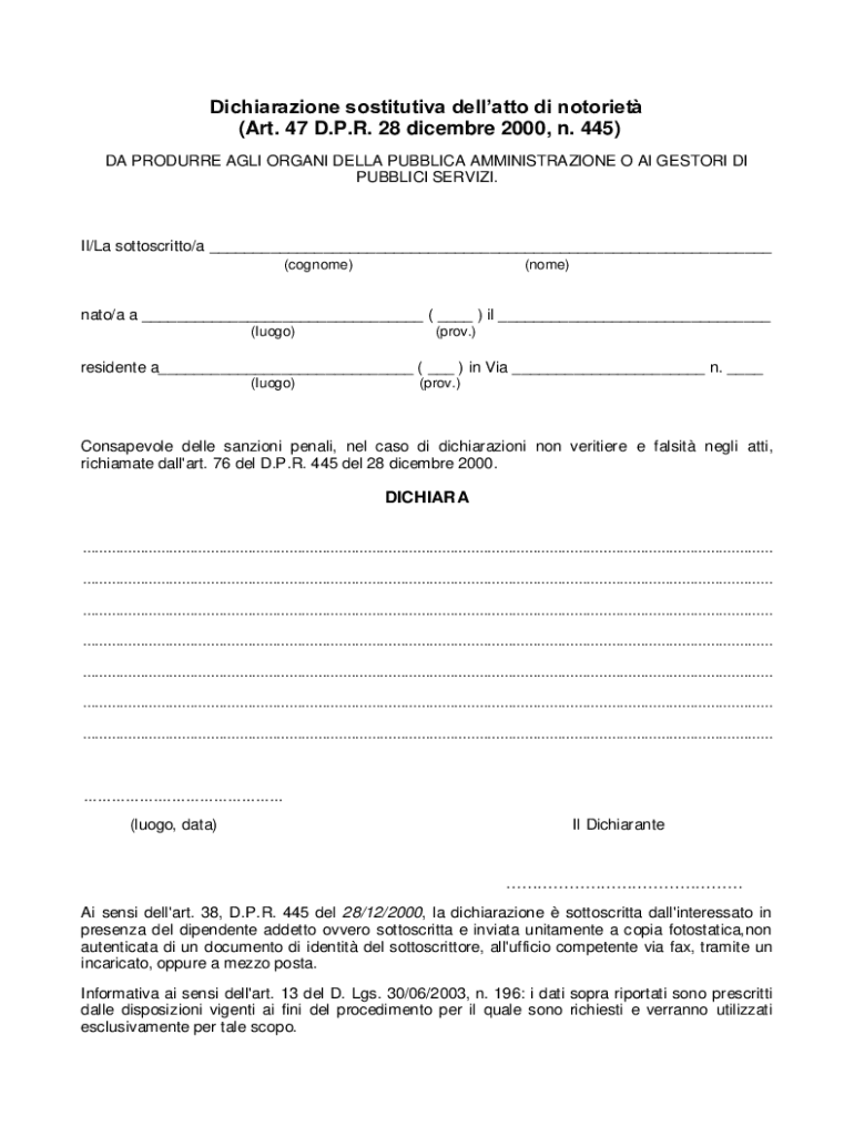 (Art. 47 D.P.R. 28 dicembre 2000, n. 445)