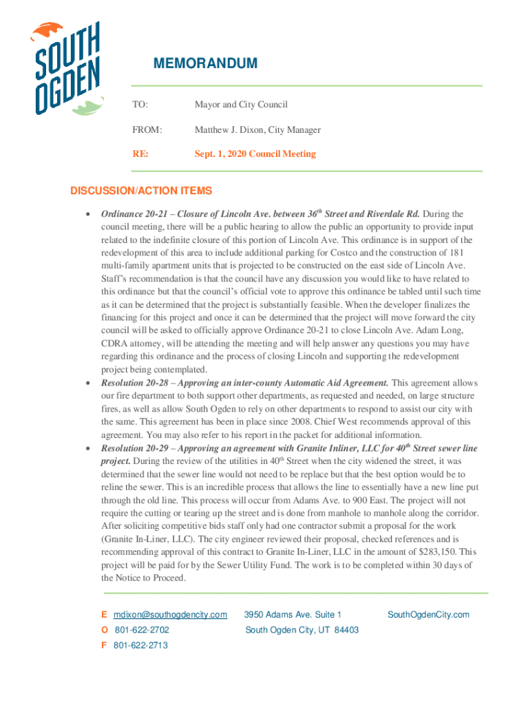 MEMORANDUM TO:Mayor and City CouncilFROM:Matthew J. Dixon, City ManagerRE:Sept. 1, 2020 Council MeetingDISCUSSION/ACTION ITEMS Ordinance 2021 Closure of Lincoln Ave. between 36th Street and Riverdale