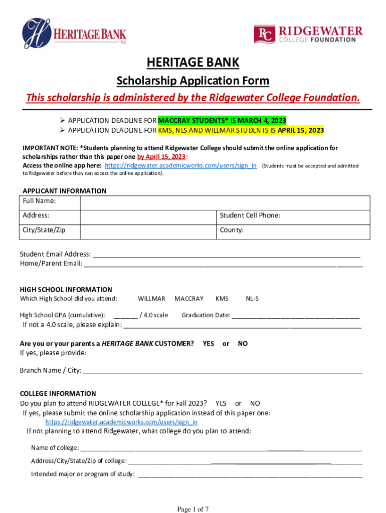 HERITAGE BANK Scholarship Application Form This scholarship is administered by the Ridgewater College Foundation. APPLICATION DEADLINE FOR MACCRAY STUDENTS* IS MARCH 4, 2023 APPLICATION DEADLINE FOR