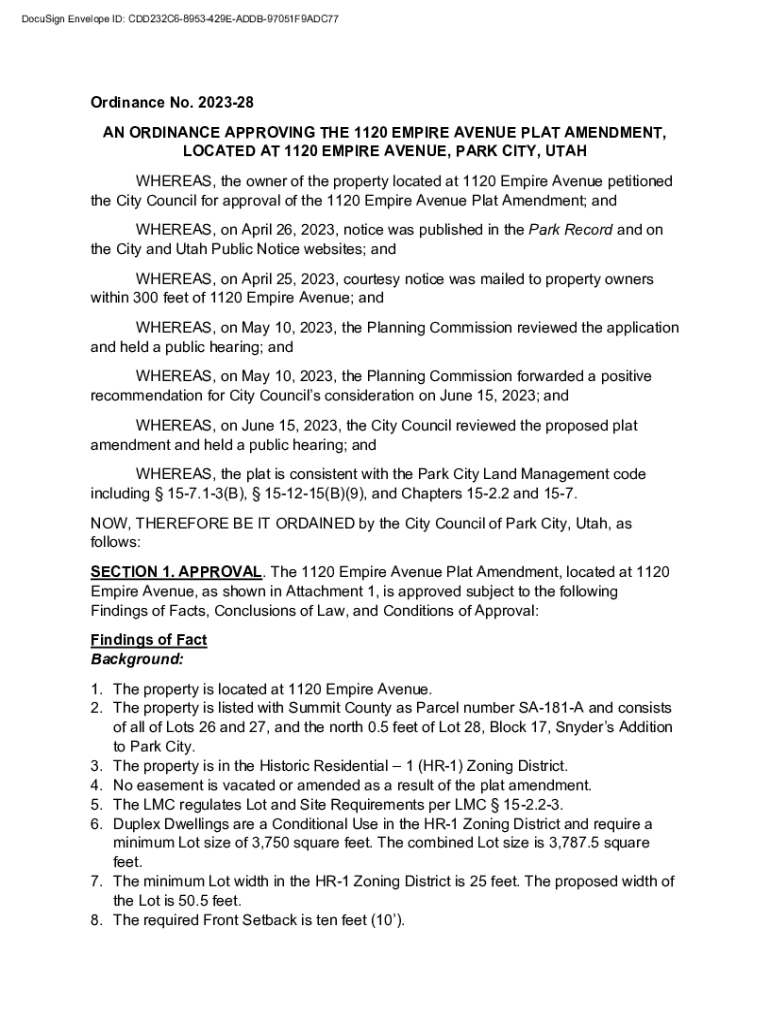 DocuSign Envelope ID: CDD232C68953429EADDB97051F9ADC77Ordinance No. 202328 AN ORDINANCE APPROVING THE 1120 EMPIRE AVENUE PLAT AMENDMENT, LOCATED AT 1120 EMPIRE AVENUE, PARK CITY, UTAH WHEREAS, the