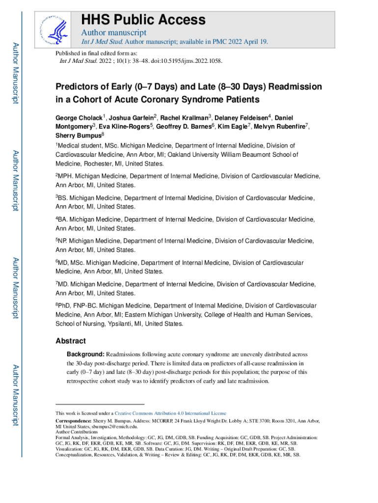 Get the free Predictors of Early (07 Days) and Late (830 Days) Readmission in a Cohort of Acute C...