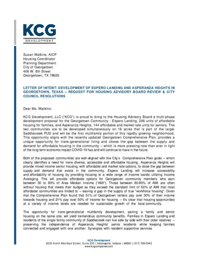 Susan Watkins, AICP Housing Coordinator Planning Department City of Georgetown 406 W. 8th Street Georgetown, TX 78626LETTER OF INTENT: DEVELOPMENT OF ESPERO LANDING AND ASPERANZA HEIGHTS IN GEORGETOWN,