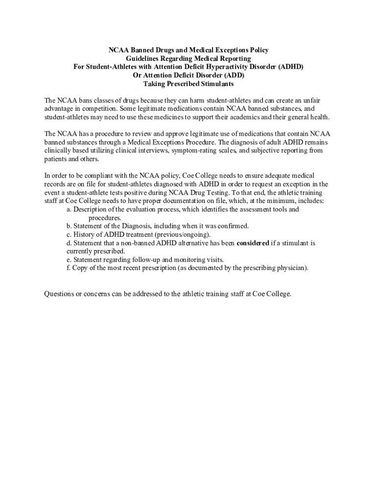 NCAA Banned Drugs and Medical Exceptions Policy Guidelines Regarding Medical Reporting For StudentAthletes with Attention Deficit Hyperactivity Disorder (ADHD) Or Attention Deficit Disorder (ADD)