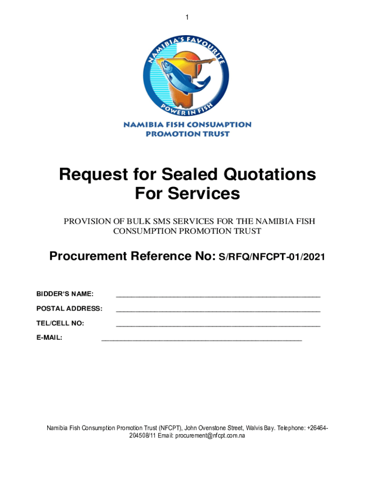 1Request for Sealed Quotations For Services PROVISION OF BULK SMS SERVICES FOR THE NAMIBIA FISH CONSUMPTION PROMOTION TRUSTProcurement Reference No: S/RFQ/NFCPT01/2021 BIDDERS NAME:___POSTAL ADDRESS:___TEL/CELL
