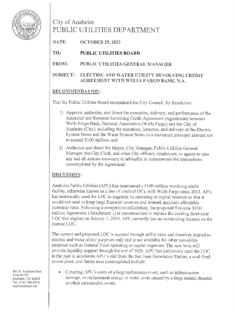 CHAPMAN DRAFT DATED OCTOBER 2, 2023AMENDED AND RESTATED REVOLVING CREDIT AGREEMENT Dated as of [___], 2023 between CITY OF ANAHEIM and WELLS FARGO BANK, NATIONAL ASSOCIATION4100954TABLE OF CONTENTS