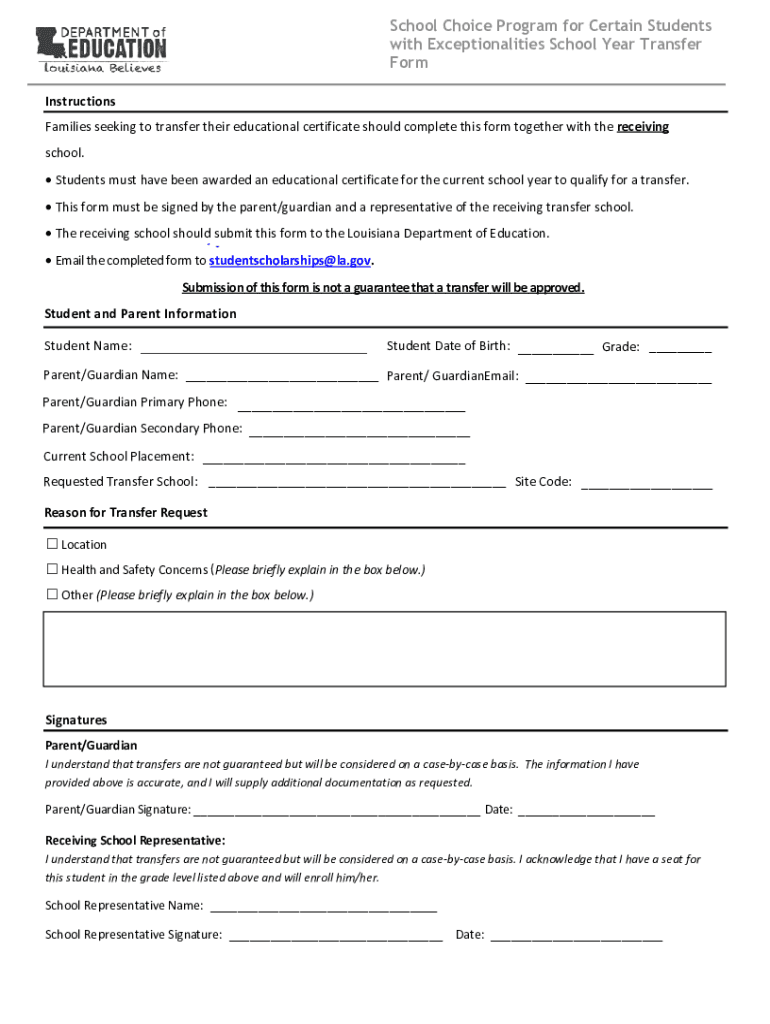 School Choice Program for Certain Students with Exceptionalities School Year Transfer Form Instructions Families seeking to transfer their educational certificate should complete this form together
