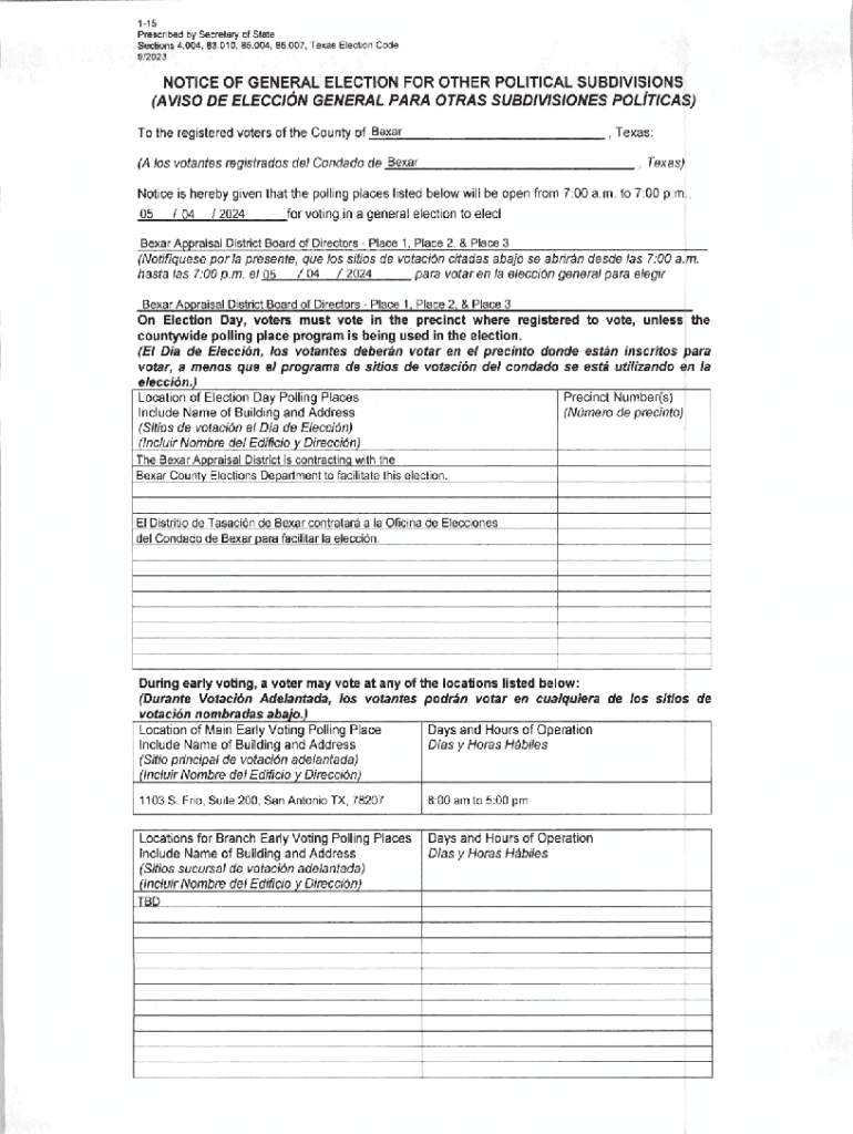 11 5 Prescribed by Secretary of State Sections 4.004, 83.010, 85.004, 85.007, Texas Election Code 9/2023NOTICE OF GENERAL ELECTION FOR OTHER POLITICAL SUBDIVISIONS (AV/SO DE ELECCION GENERAL PARA