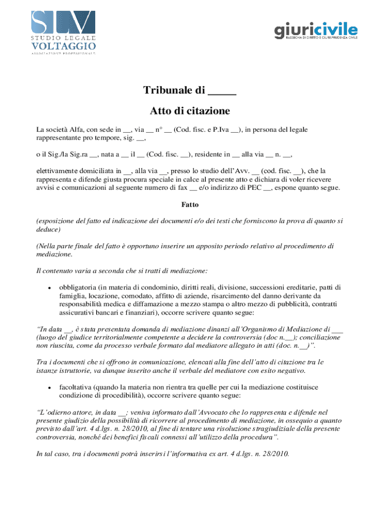 Tribunale di ___ Atto di citazione La societ Alfa, con sede in __, via __ n __ (Cod. fisc. e P.Iva __), in persona del legale rappresentante pro tempore, sig. __, o il Sig./la Sig.ra __, nata a __