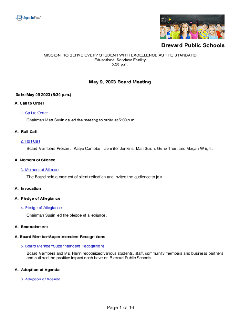Brevard Public Schools MISSION: TO SERVE EVERY STUDENT WITH EXCELLENCE AS THE STANDARD Educational Services Facility 5:30 p.m.May 9, 2023 Board Meeting Date: May 09 2023 (5:30 p.m.) A. Call to Order