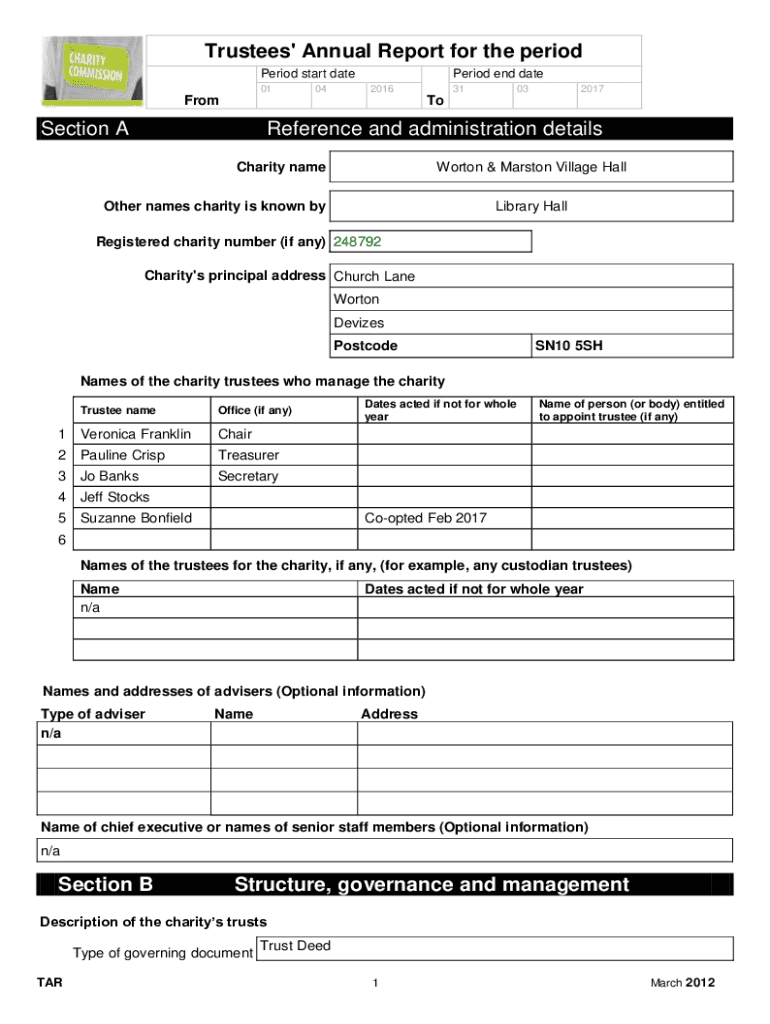 Trustees\' Annual Report for the period Period start date 0104Period end date 2016From31032017ToSection AReference and administration details Charity nameWorton & Marston Village HallOther names charity