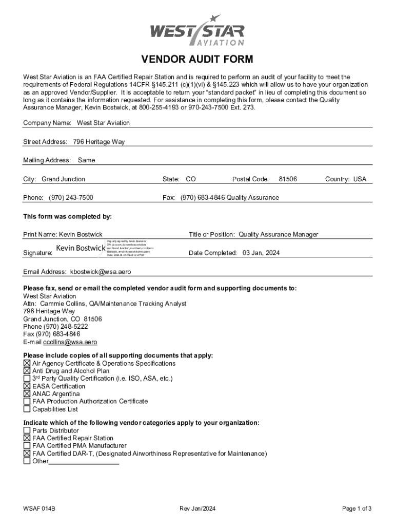 VENDOR AUDIT FORM West Star Aviation is an FAA Certified Repair Station and is required to perform an audit of your facility to meet the requirements of Federal Regulations 14CFR 145.211 (c)(1)(vi)