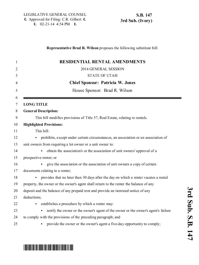LEGISLATIVE GENERAL COUNSEL 6 Approved for Filing: C.R. Gilbert 6 6 022114 4:54 PM 6S.B. 147 3rd Sub. (Ivory)Representative Brad R. Wilson proposes the following substitute bill:1RESIDENTIAL RENTAL