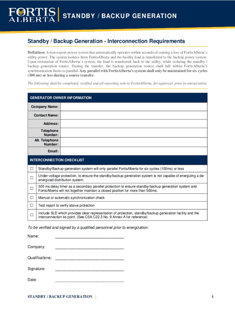 | STANDBY / BACKUP GENERATION Standby / Backup Generation Interconnection Requirements Definition: A nonexport power system that automatically operates within seconds of sensing a loss of FortisAlbertas