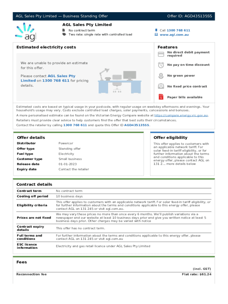 AGL Sales Pty Limited Business Standing OfferOffer ID: AGD435135SSAGL Sales Pty LimitedNo contract termTwo rate: single rate with controlled loadEstimated electricity costsCall 1300 768 611www.agl.com.auFeatures