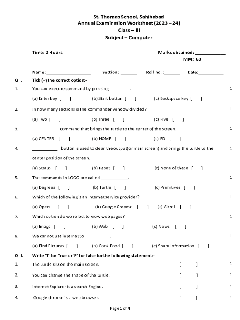 St. Thomas School, Sahibabad Annual Examination Worksheet (2023 24) Class III Subject Computer Time: 2 HoursMarks obtained: ___ MM: 60Name :___Section : ___Q I.Tick ( ) the correct option:1.You can