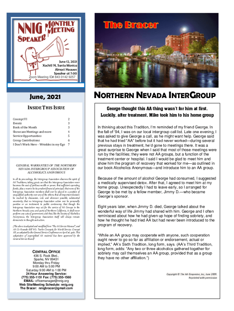 June 12, 2021 Xochitl N, Santa Monica Almost Heaven Speaker at 7:00 Zoom Meeting ID# 843 0142 9257NORTHERN NEVADA INTERGROUPJune, 2021 INSIDE THIS ISSUE Concept VI Events Book of the Month Showcase