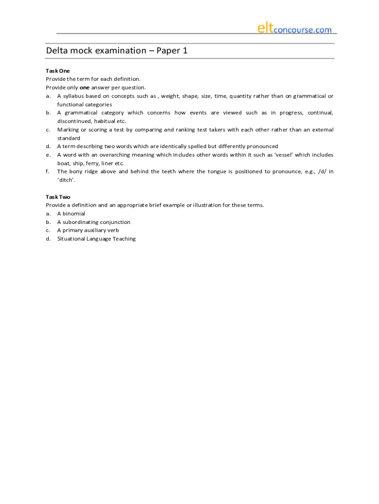 Delta mock examination Paper 1 Task One Provide the term for each definition. Provide only one answer per question. a. A syllabus based on concepts such as , weight, shape, size, time, quantity rather
