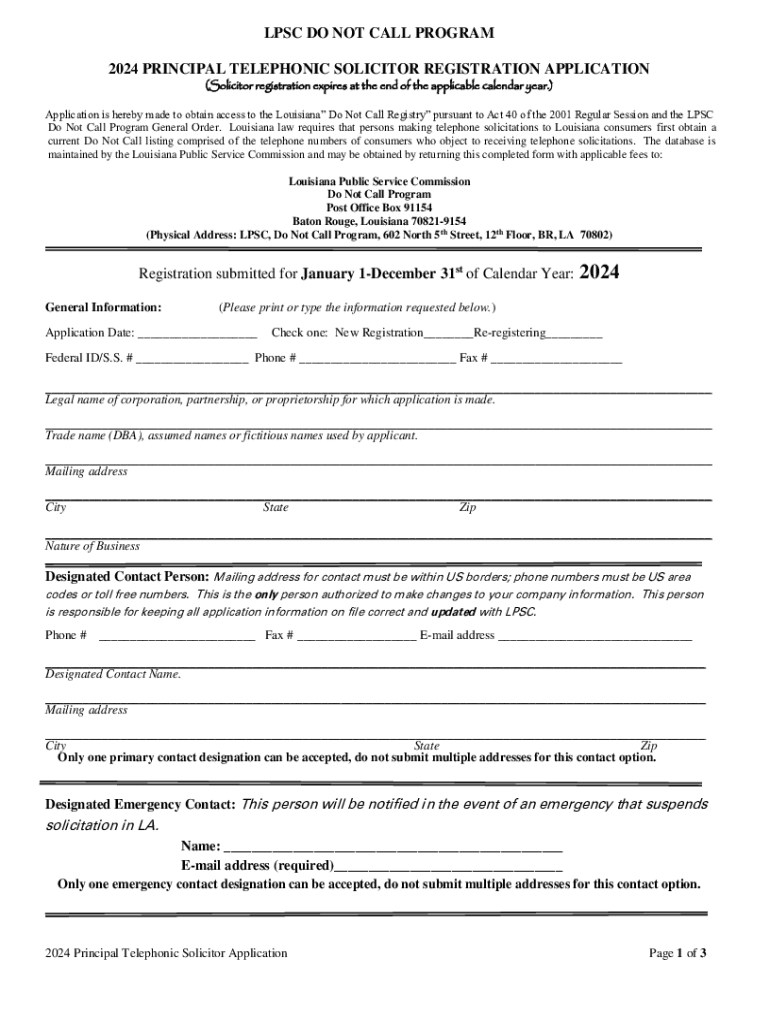 LPSC DO NOT CALL PROGRAM 2024 PRINCIPAL TELEPHONIC SOLICITOR REGISTRATION APPLICATION (Solicitor registration expires at the end of the applicable calendar year.)Application is hereby made to obtain